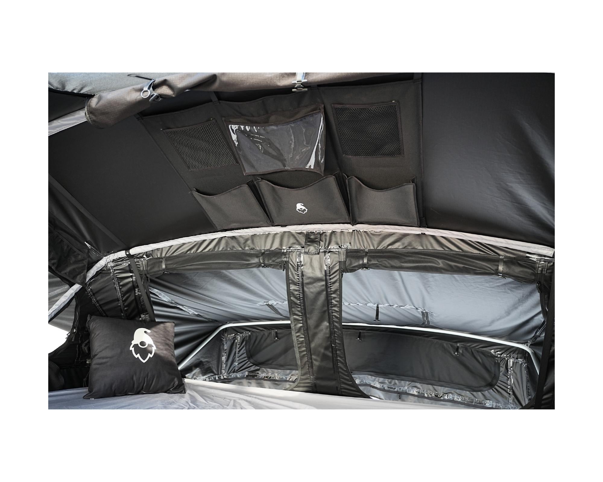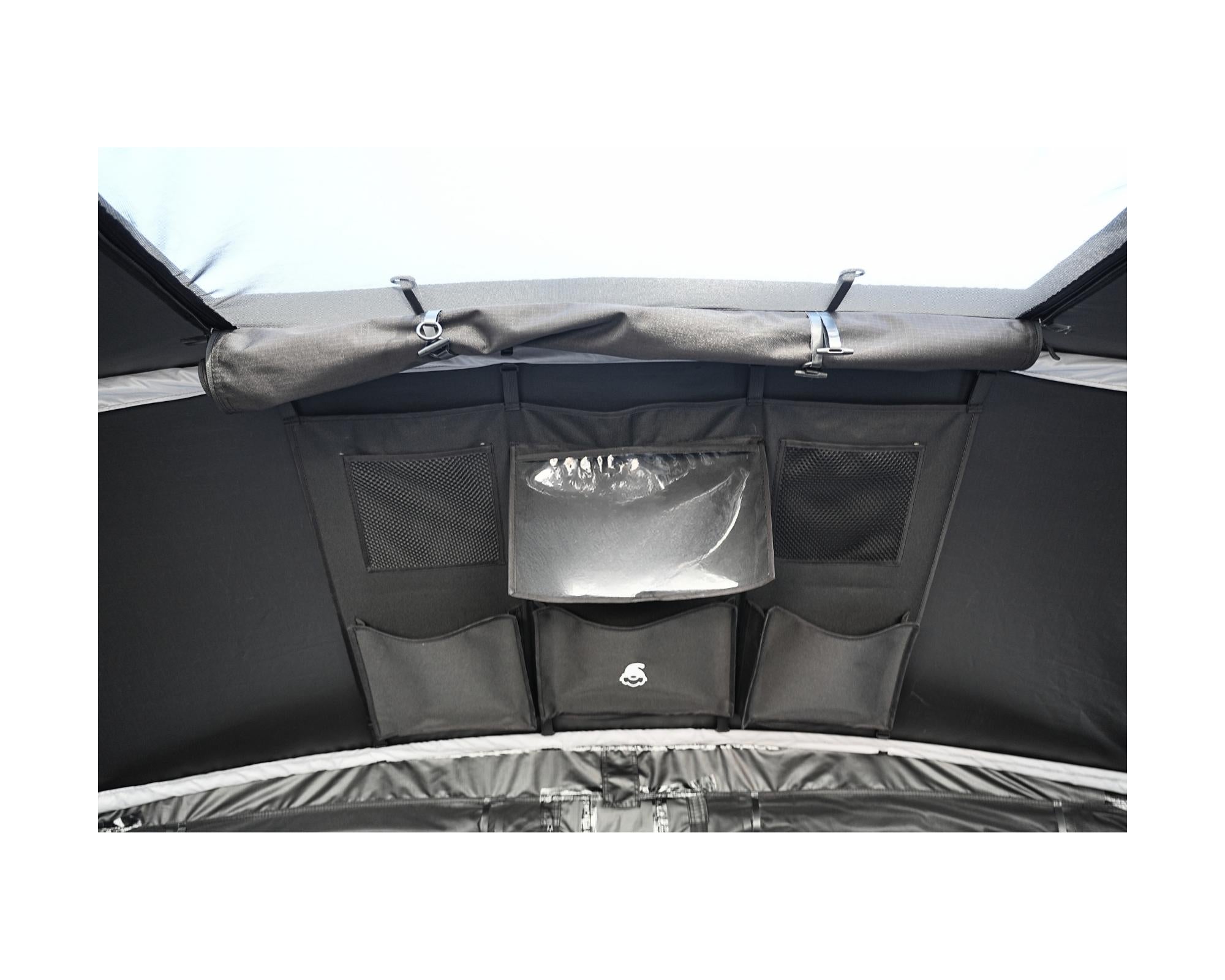 Mehr Ordnung, mehr Platz, weniger Suchen: Die Aufbewahrungstasche wird mit Clips direkt am Zeltgestänge befestigt und schafft im Dachzelt zusätzlichen Stauraum genau dort, wo du ihn brauchst. Fünf praktische Taschen bieten Platz für Brille, Stirnlampe, Buch & Co.